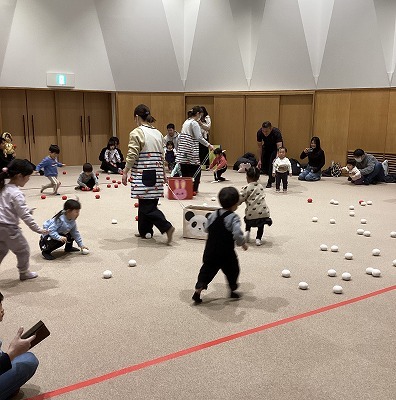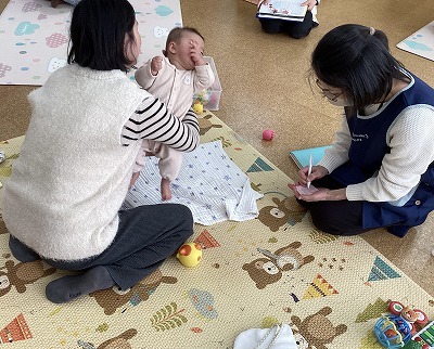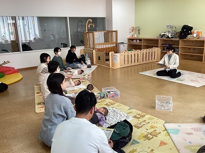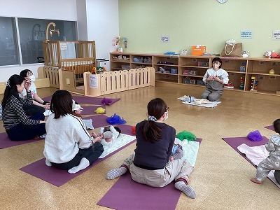 ふれあい遊びを楽しんだ後オイルを使って「大きな栗の木の下で」などの身近な歌を歌いながらやさしくマッサージしました。ママの手もぽかぽかして、またお子さんたちも気持ちよさそうにニコニコして素敵な時間が過ごせました。