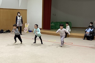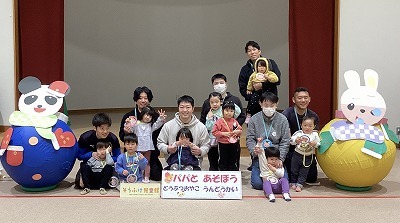 パパと一緒にかけっこや玉入れ、大玉転がしを楽しみました。最後にがんばった子どもたちとパパにメダルを渡すとみんなにこにこ笑顔でした。