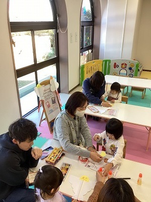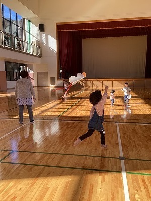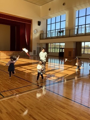 お部屋で凧を作ってから、3階の多目的ホールで凧あげをしました。ママ、パパもお子さんと一緒に走り、親子で凧あげを楽しみながら良い運動の場にもなったようです。
