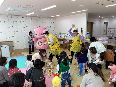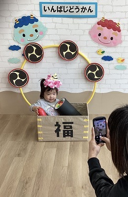 2月3日は節分。いんば児童館の豆まきにいんザイ君があそびにきてくれました。鬼さんが登場するとみんなで豆まき!!ご褒美にいんザイ君シールをもらったり、フォトコーナーでは写真撮影もでき、みんなで節分を楽しみました。