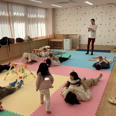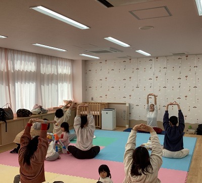 お子さんと一緒にストレッチ。親子の笑顔が弾けます。ママたちは普段使わないようなところをゆっくりしっかり伸ばしてリフレッシュできたようです。