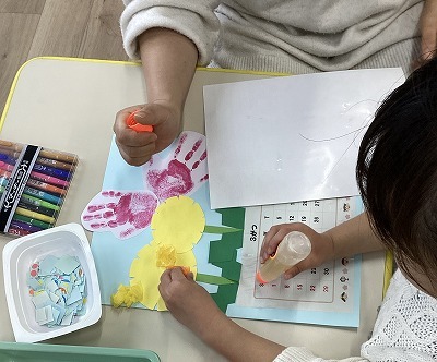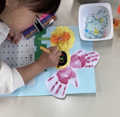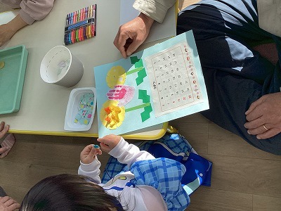 今月の制作は3月のカレンダー作り。手形をちょうちょうにして、おはながみでたんぽぽをつくり、絵を描いて、すてきなカレンダーができあがりました。