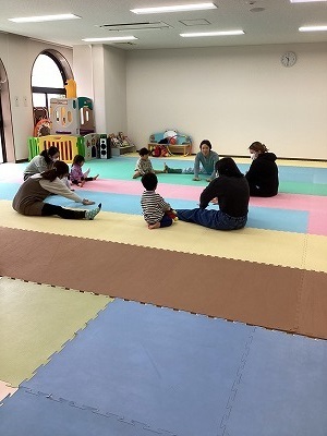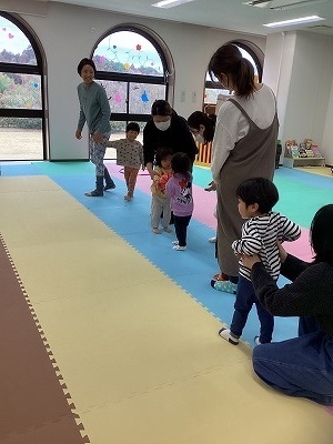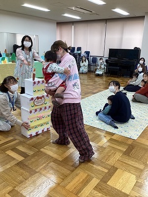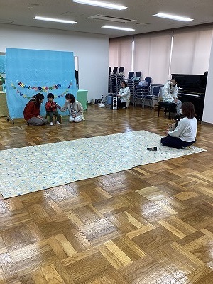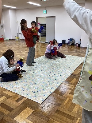 ポンポンを持ってのダンス後、インタビューでは、3歳の子は自分で答えることができていました。ペープサートのおはなしでは、参加者全員で「がんばれ!がんばれ!」と応援の声もあがり、盛りあがりました。