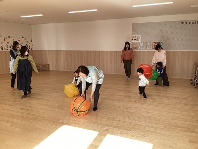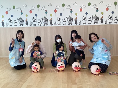最終回、体調を崩して欠席するお友達が多く残念でしたが、キャンディボールや大きなポリボールでキャッチボールや転がしかけっこをしました。バルーンアンパンマンとネーム入り缶バッジを作り、みんな大喜びでした。