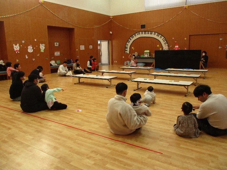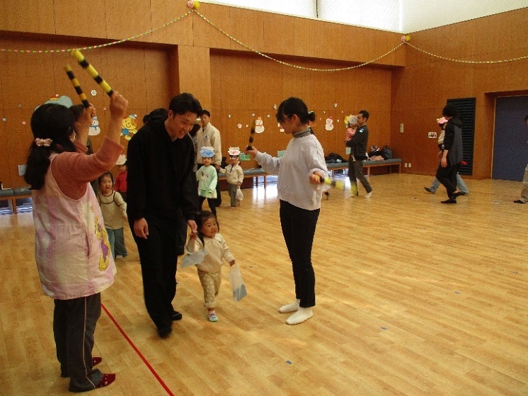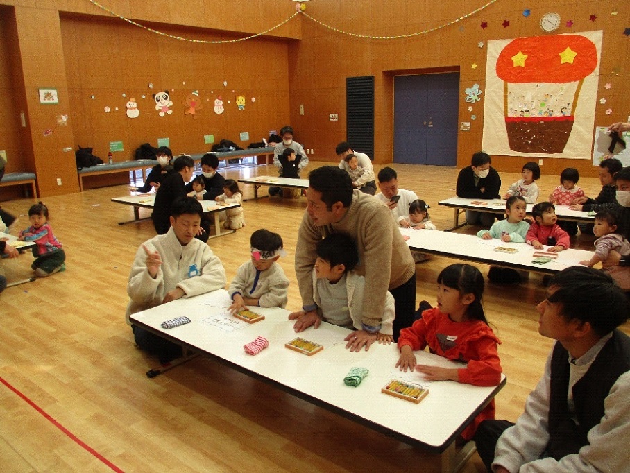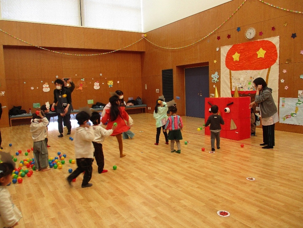 今月は「まめまき会で悪い鬼を退治しよう」でした。アンパンマンのお話は、みんなのおなかの中にいる悪い鬼を退治するお話でした。お父さんと一緒に鬼のお面を作ったら、冒険に出発!海を渡り、桃太郎と一緒に鬼ヶ島に到着です。小さい鬼と大きい鬼が出てきましたが、みんなで力を合わせて、「鬼は外、福は内」の掛け声を言いながら、退治することができました。使ったボールもきちんとお片付けをすることができ、電車に乗ってお家に帰りました。パパタイムでは毎回参加してくださるお父さんもいて職員も安心してお子さんの様子を見守ることができます。子どもたちの成長を一緒に見守ることが出来てとても嬉しい時間になっています。3月はわんぱくサンデーでお雛祭りと一年間の成長をお祝いする会を行いますので皆さんぜひお待ちしています。