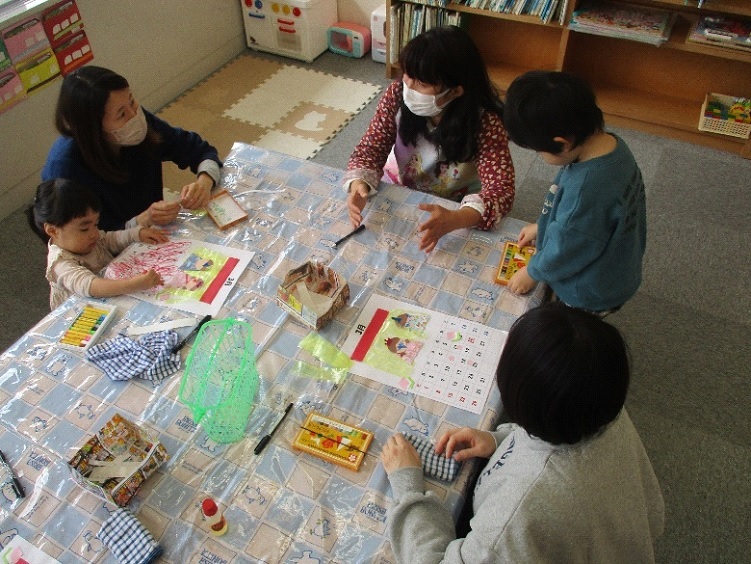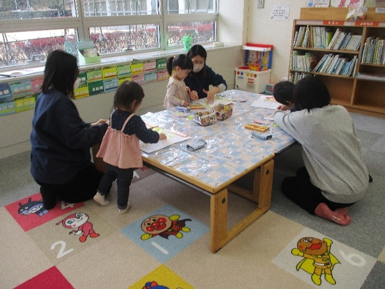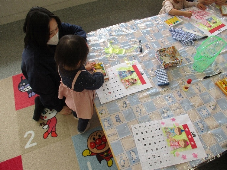 今月は3組の親子が参加し、お雛様のカレンダーを作りました。黄色のスズランテープで屏風を作ったら、お雛様とお内裏様を貼って完成です。子どもたちは、クレヨンの色やパーツの配置をよく考えていました。お母さんたちのサポートもあって、大満足のカレンダーができましたね。毎回、季節のつどいの日は、親子で来館してお部屋に入った時にどんなカレンダーを作るのか、準備してある材料を見ながら楽しみにしてくれています。そんな姿を見て職員もとても嬉しくなります。今回で1年分のカレンダーを作り終えました。次回は、令和7年度最後の季節のつどいとなり修了式を行います。いろいろとご協力ありがとうございました。令和8年度新たなメンバーを募集します。又4月のカレンダーを作りながら、親子同士の交流も楽しみましょう。職員一同お待ちしています。