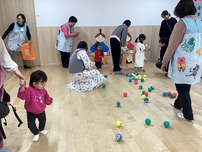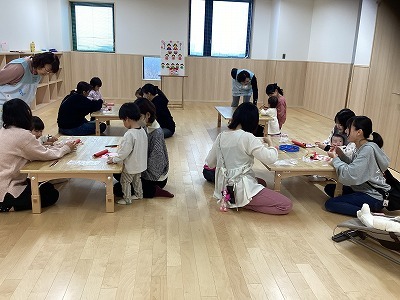 ひなまつりにちなんだボール入れゲームや、お内裏様とお雛様のタペストリー作りを楽しみました。作った作品はみんなにお披露目!アレンジ光るタペストリーが出来上がりました。
