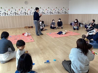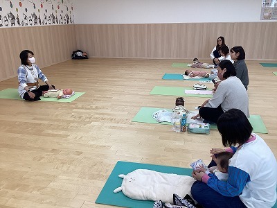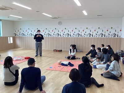 印西西消防署の方から熱性けいれんやケガ、異物除去の対応や胸骨圧迫の仕方を実際に体験できるなど参加者はとても真剣に聞いていました。万が一に備え気を付けることや参加者からの質問等も多く貴重な講座でした。