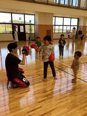 世界チャンピオンを講師に迎え、多目的ホールいっぱいを使ってまずはウォーミングアップを行いました。普段やらないような機敏な動きに戸惑いながらも「わ~」「え~」という声はどこか楽しそうでした。最後に世界チャンピオンを相手に一人ずつスパークリングしてもらえました。