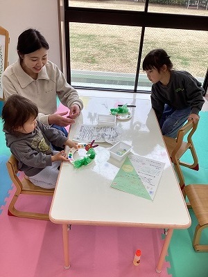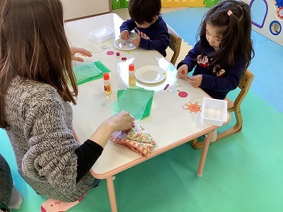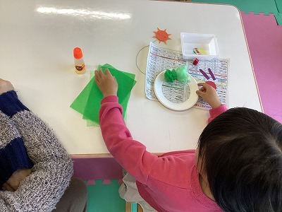 お花紙を丸めたり、シールを貼ったりして、『あおむしのリース』を作りました。楽しんで取り組む姿が見られ、出来上がると嬉しそうに作品を見せてくれました。